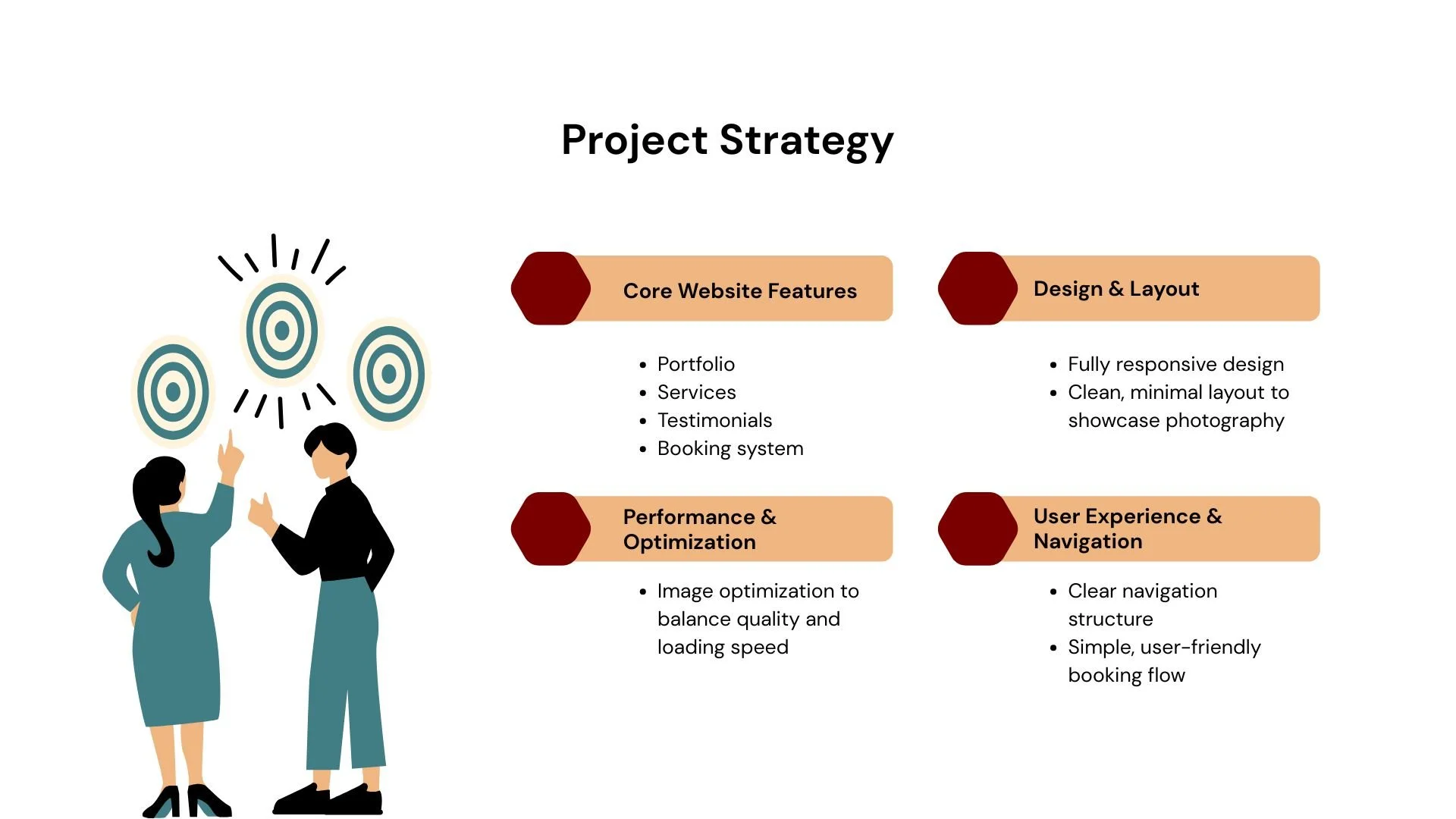 Users want to quickly view the photographer’s portfolio, understand services and pricing, trust their work through testimonials, and easily book a session on any device.